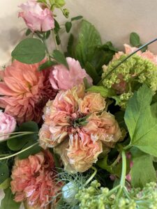 レッスン1回でブーケを仕上げられる?と不安なご様子でしたが頑張られ、本番はお嬢さんのリクエストの芍薬が運良く手に入り、可愛いブーケの作成をお手伝いさせていただきました。