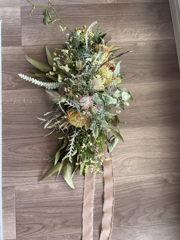 また、夏はお花がどうしても傷みやすいので、最初からドライになりやすいスターチス、アジサイ、ネイティブフラワーなどでブーケを作り、2,3日楽しんだ後に壁に吊るすと自然にスワッグになります。とても簡単で実用的です。デザインや花材をクールな印象にすると男性でも飾りやすいスワッグになります。